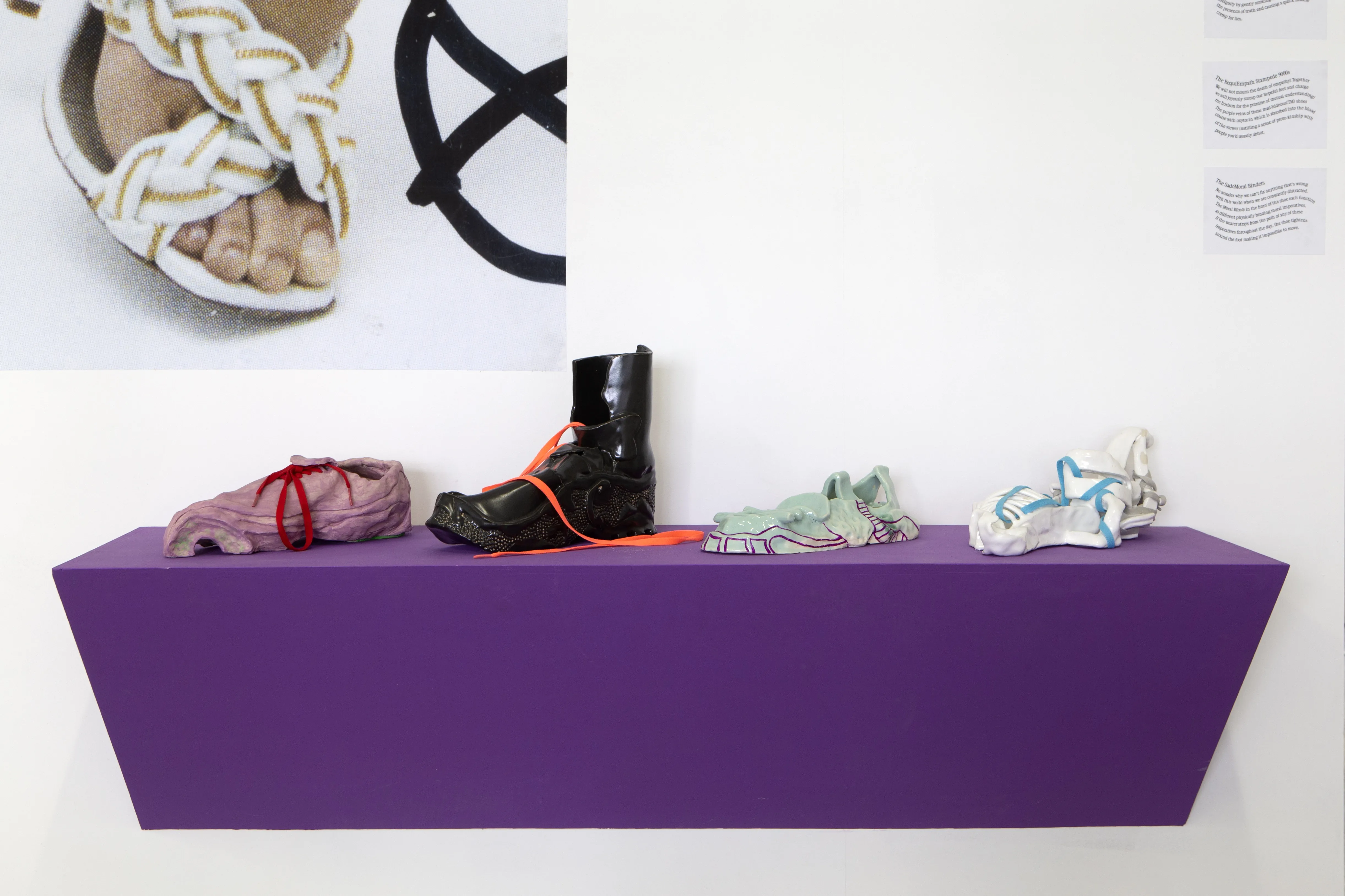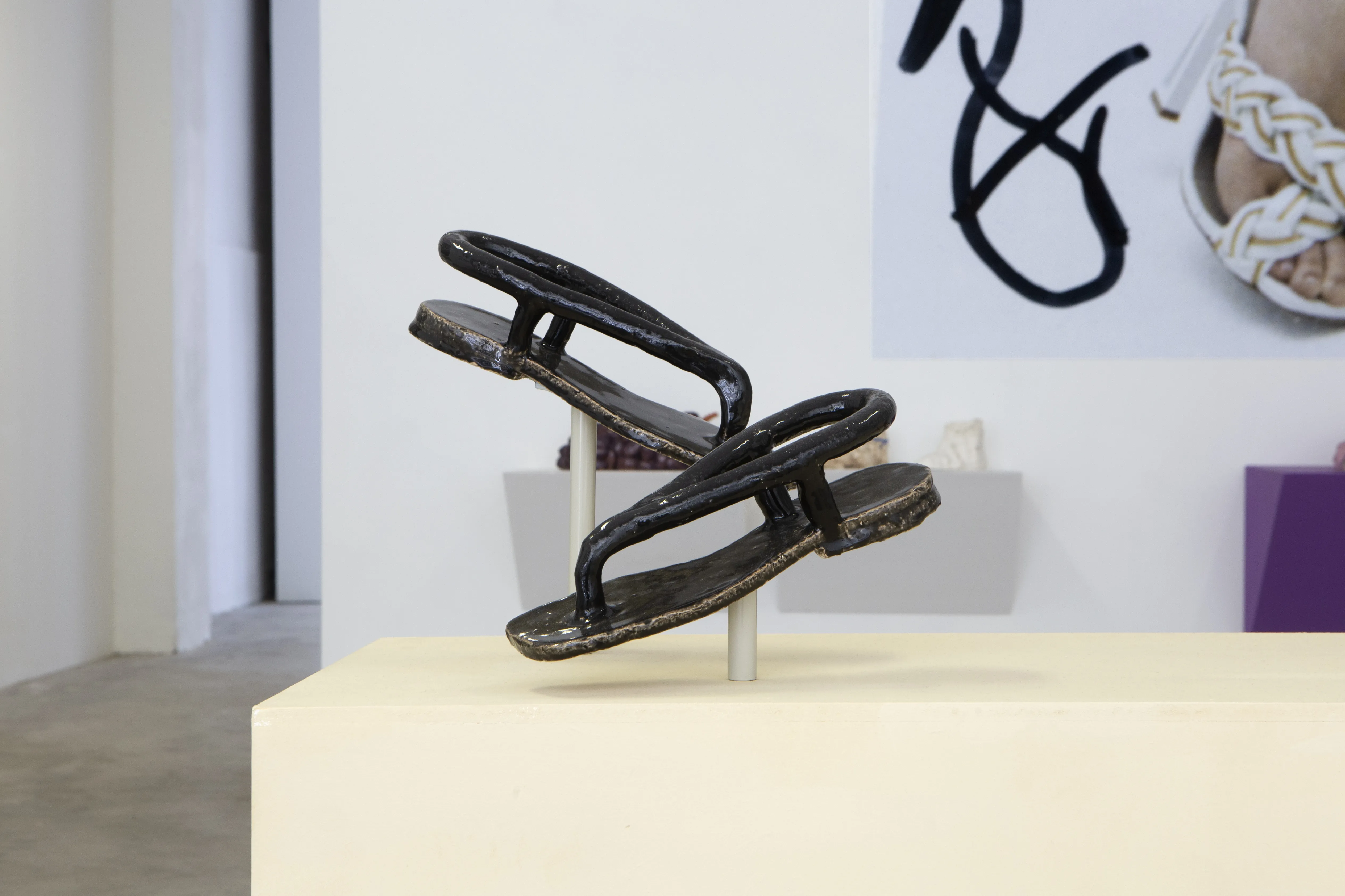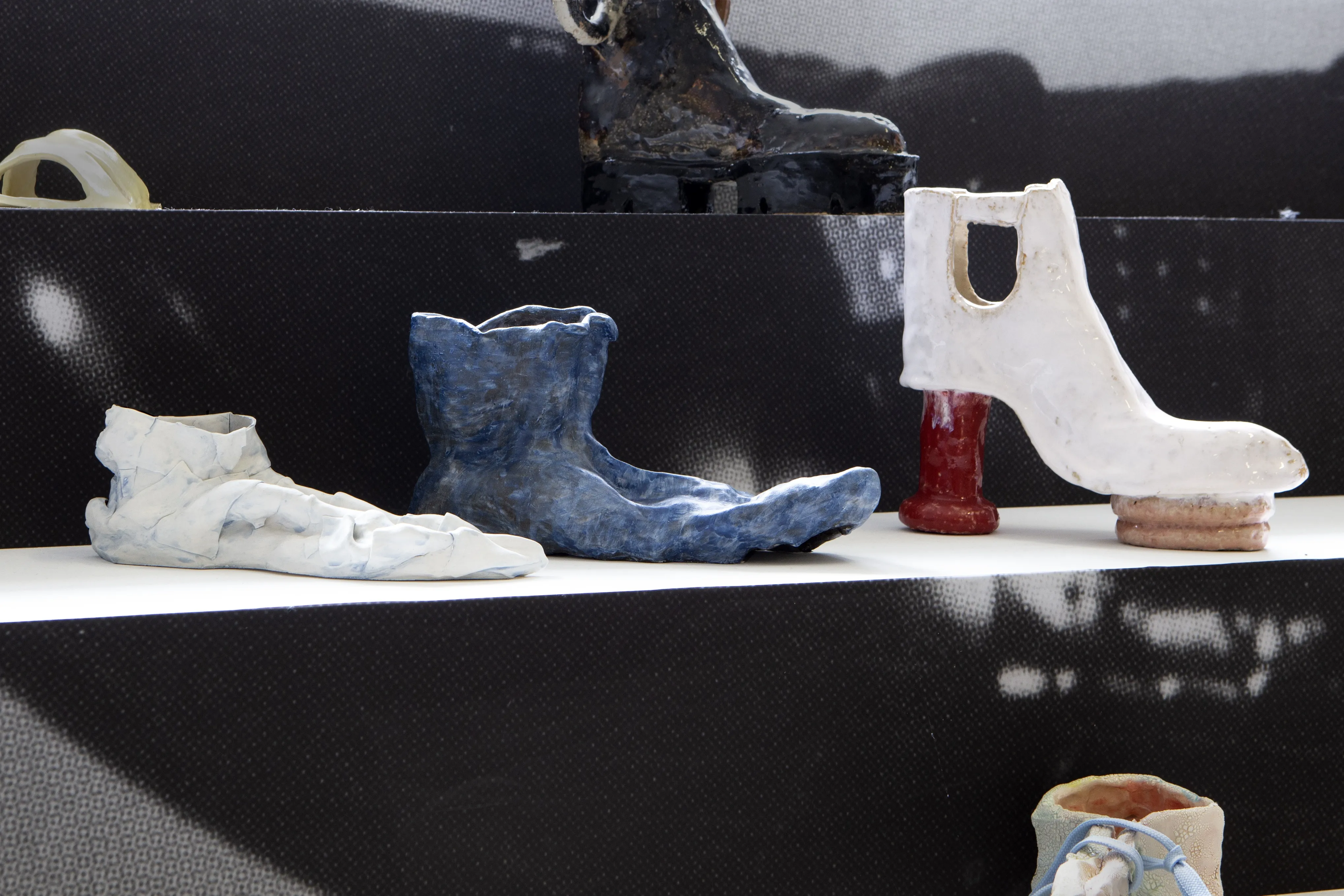 Starting as first a mental collection and later a slowly growing folder of snapshots of encountered shoes over the years, the exhibition zooms in on this medium within a medium and the shoe as a vessel for ideas, dreams and values. Some of the works allude to a feeling of home, others explore gender roles, capitalist fetishes and futures, or simply act as containers for larger sculptures. Whilst the shoestore-like scenography might suggest otherwise: these shoes are not just objects, and certainly weren’t made for walking.
