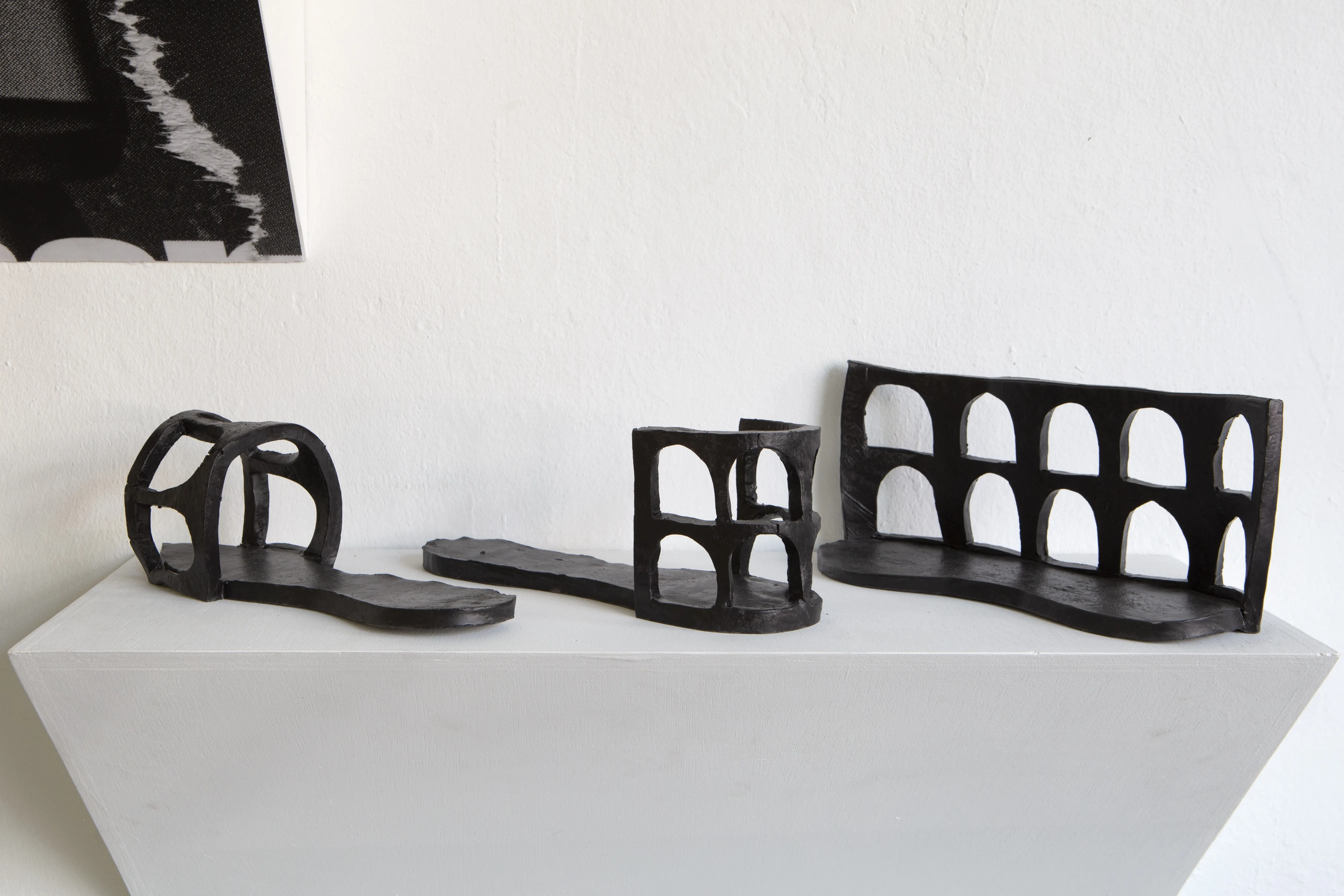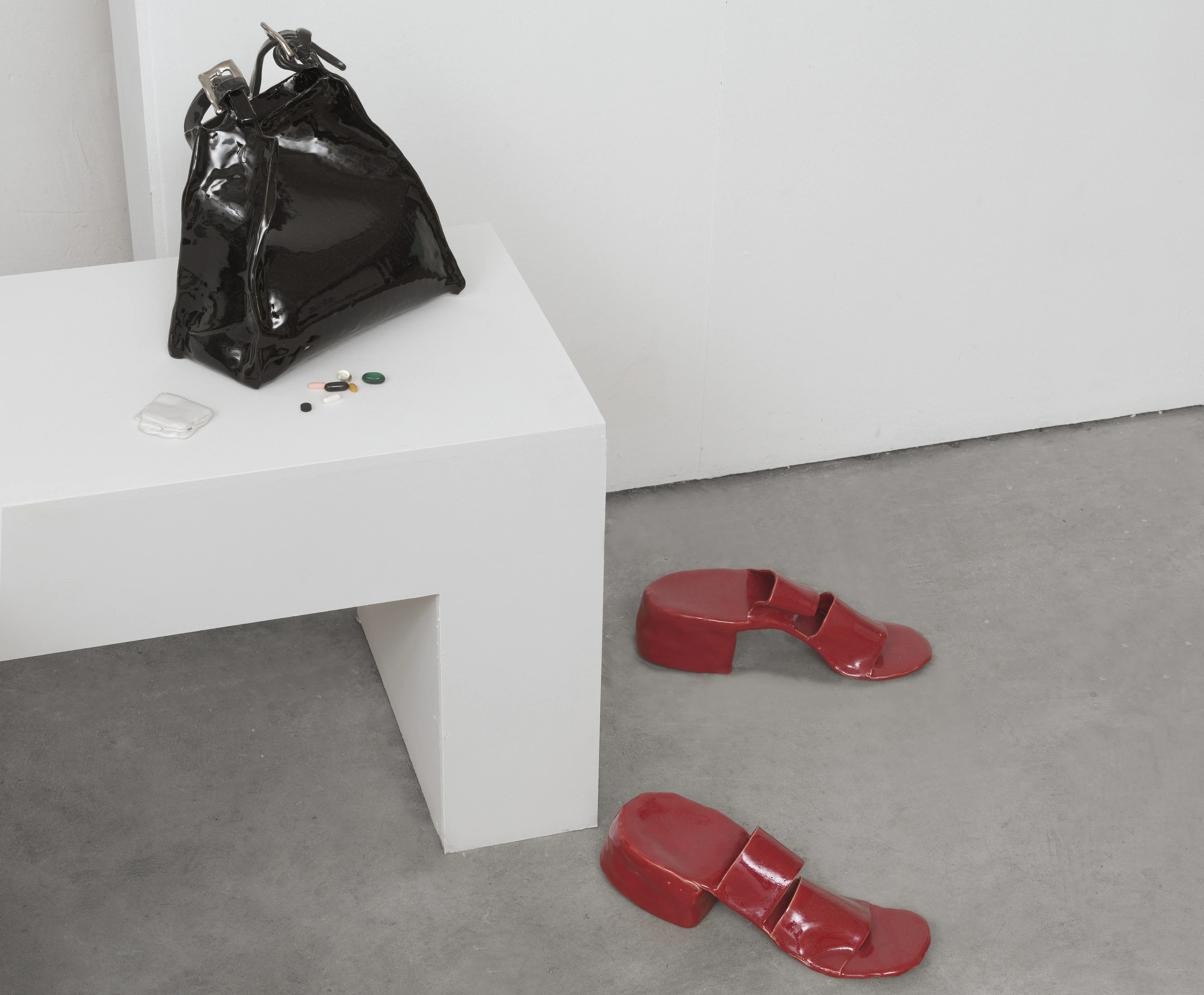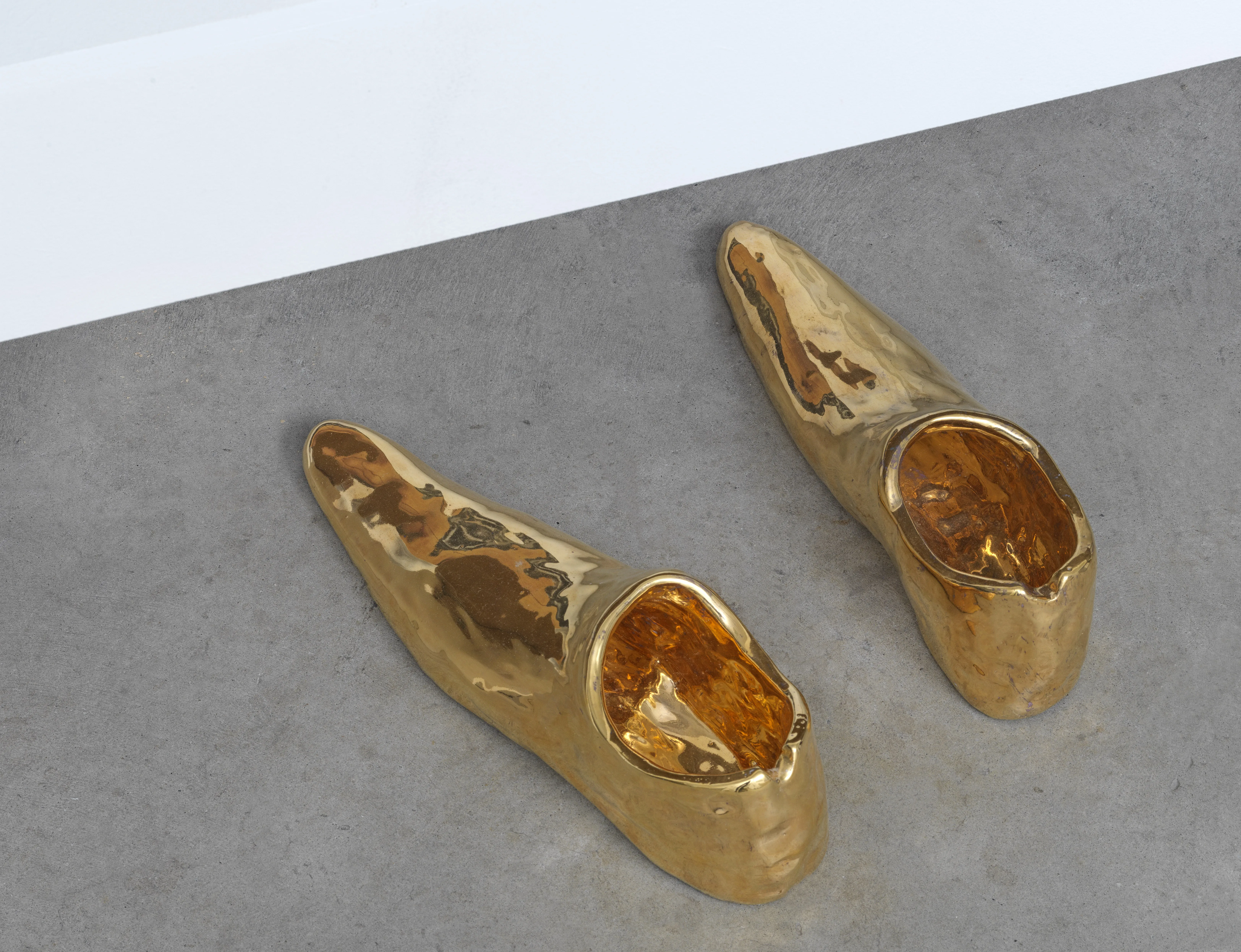 Starting as first a mental collection and later a slowly growing folder of snapshots of encountered shoes over the years, the exhibition zooms in on this medium within a medium and the shoe as a vessel for ideas, dreams and values. Some of the works allude to a feeling of home, others explore gender roles, capitalist fetishes and futures, or simply act as containers for larger sculptures. Whilst the shoestore-like scenography might suggest otherwise: these shoes are not just objects, and certainly weren’t made for walking.